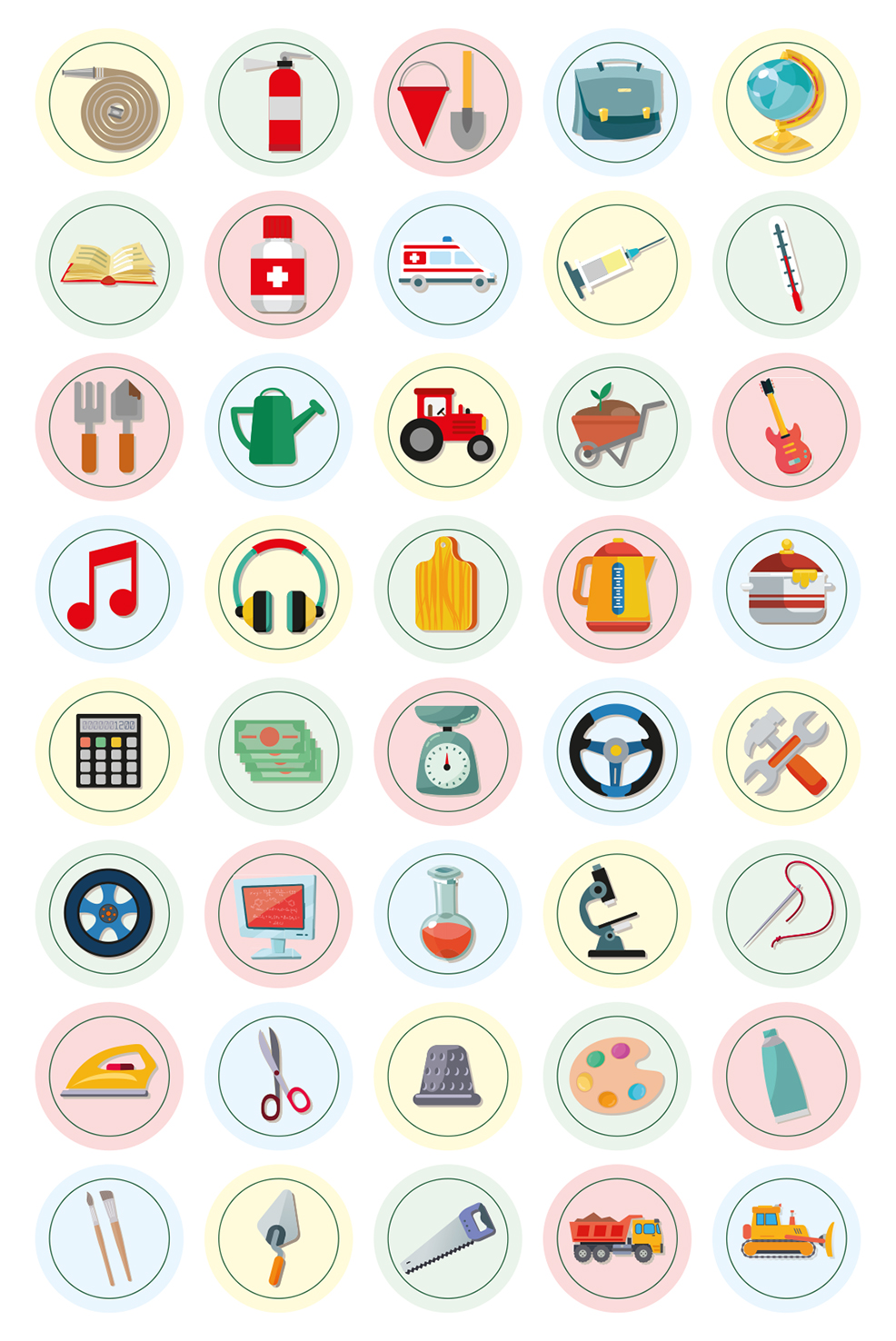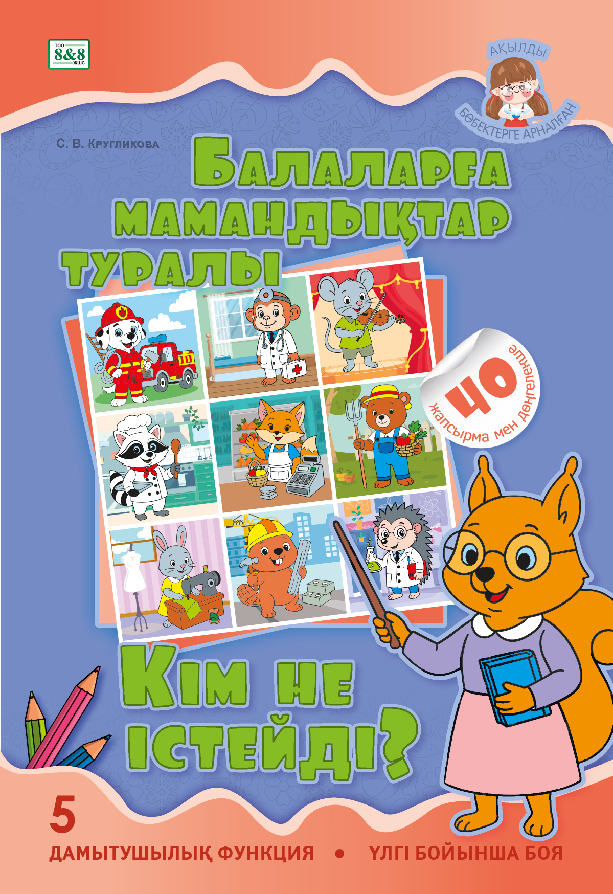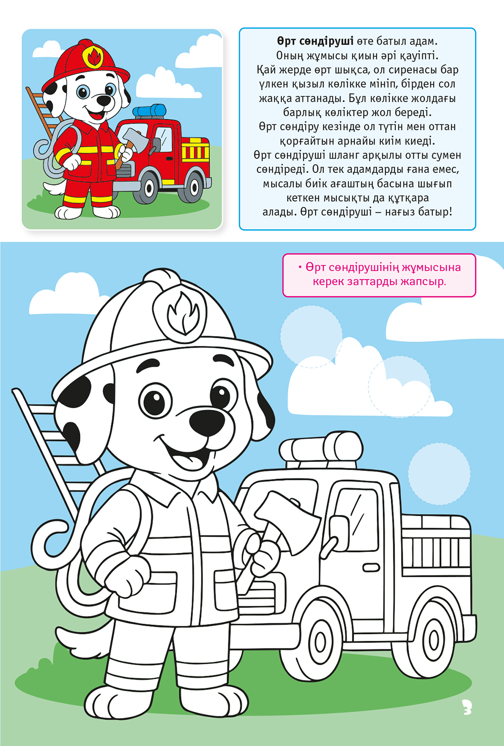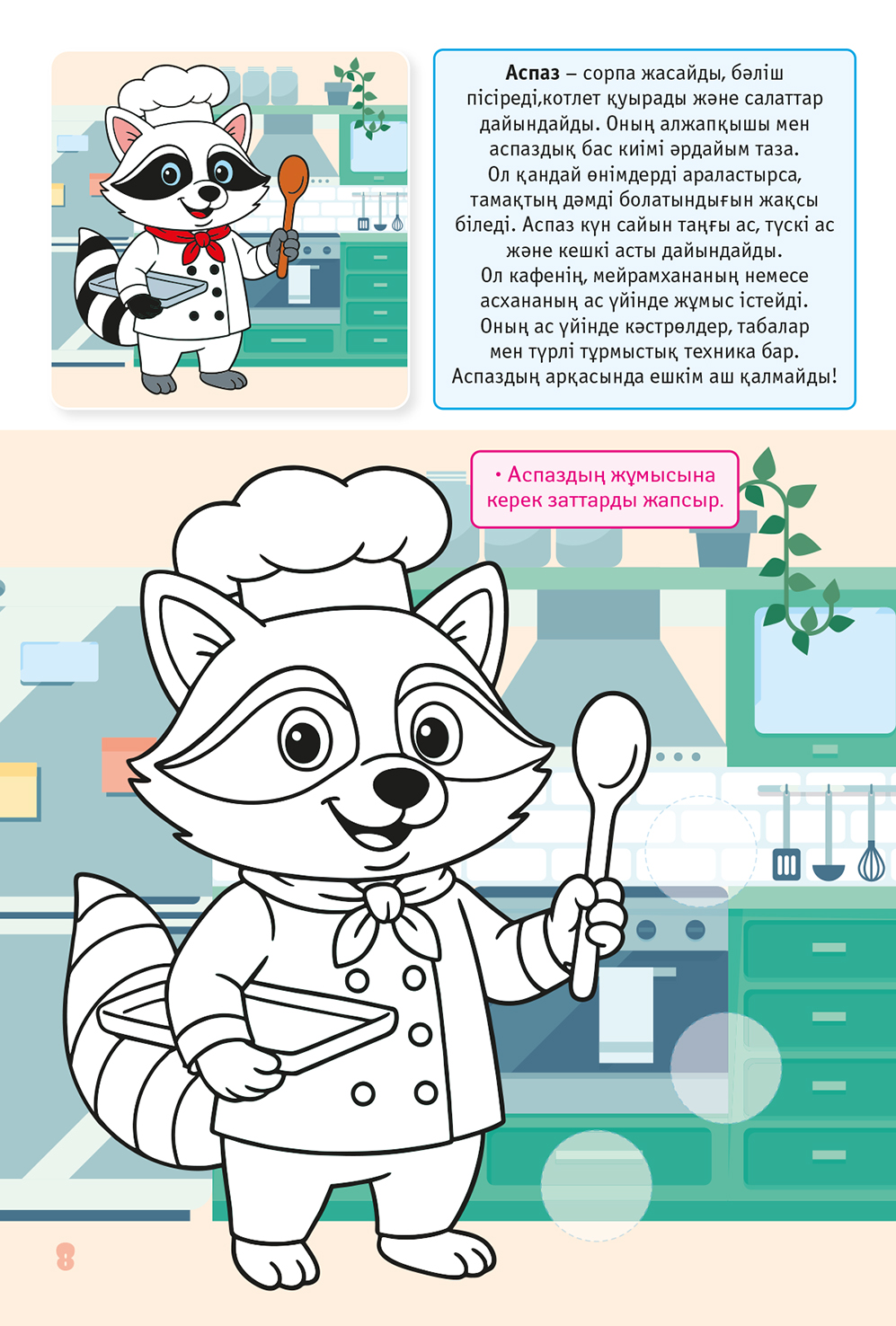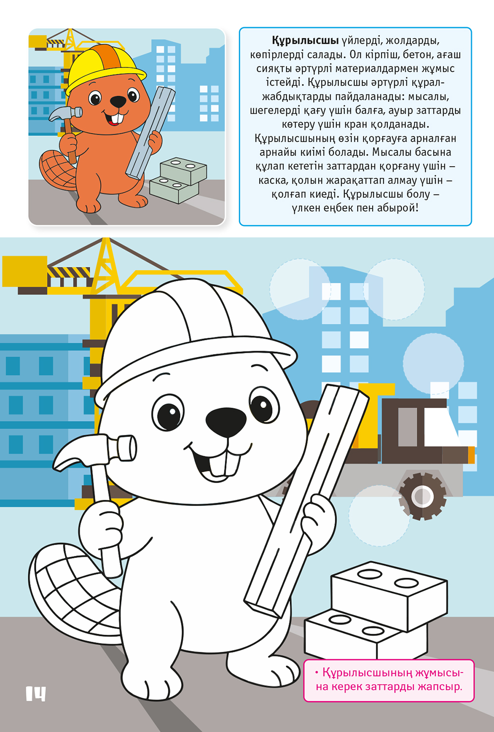 Әр бетте – үлгіге қарай отырып бояуға арналған сурет берілген, мамандық туралы қысқа әңгіме және балаға арналған жапсырмалармен тапсырма бар.