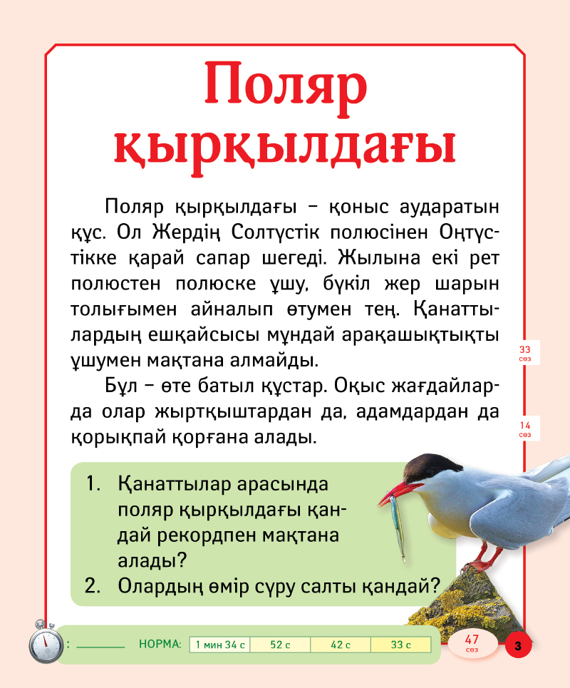 Әртүрлі қаріппен жазылған мәтін. Әріпті танып білу оқу жылдамдығын жылдамдатуға мүмкіндік береді. Оқуды өзіндік тексеру. Әрбір әңгіменің соңында оқу жылдамдығының қорытындысы мен нормасын жазуға арналған орын берілген.