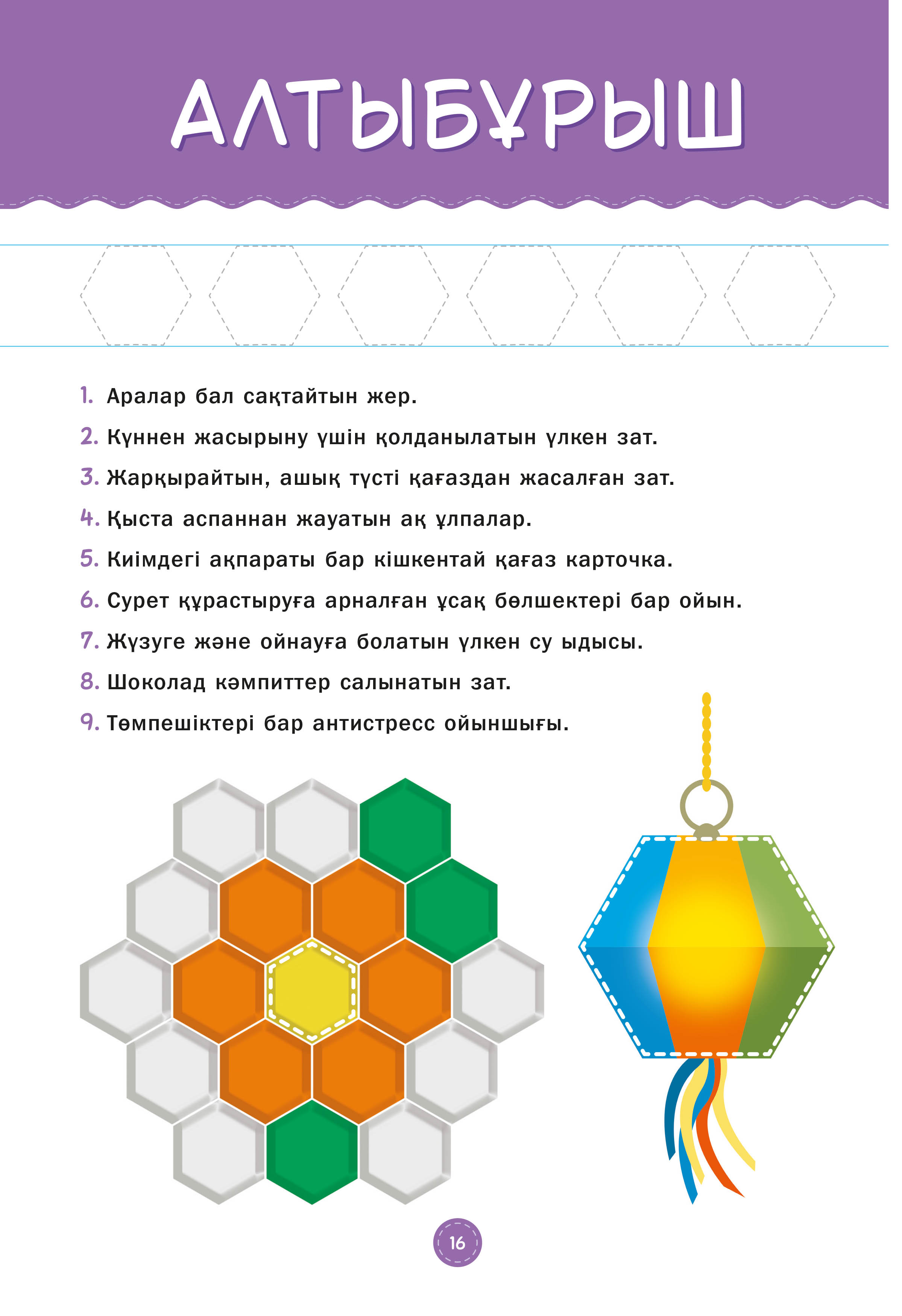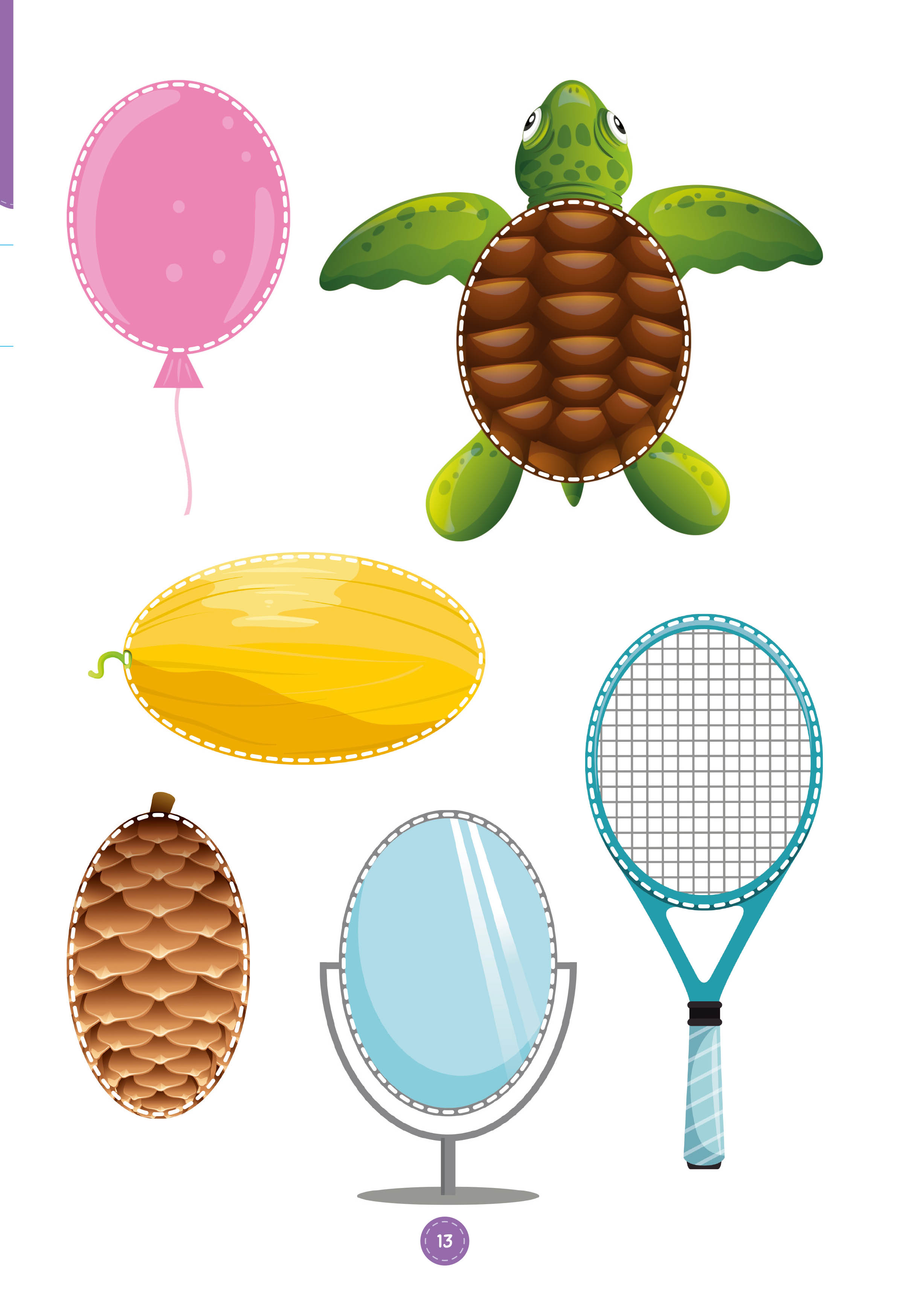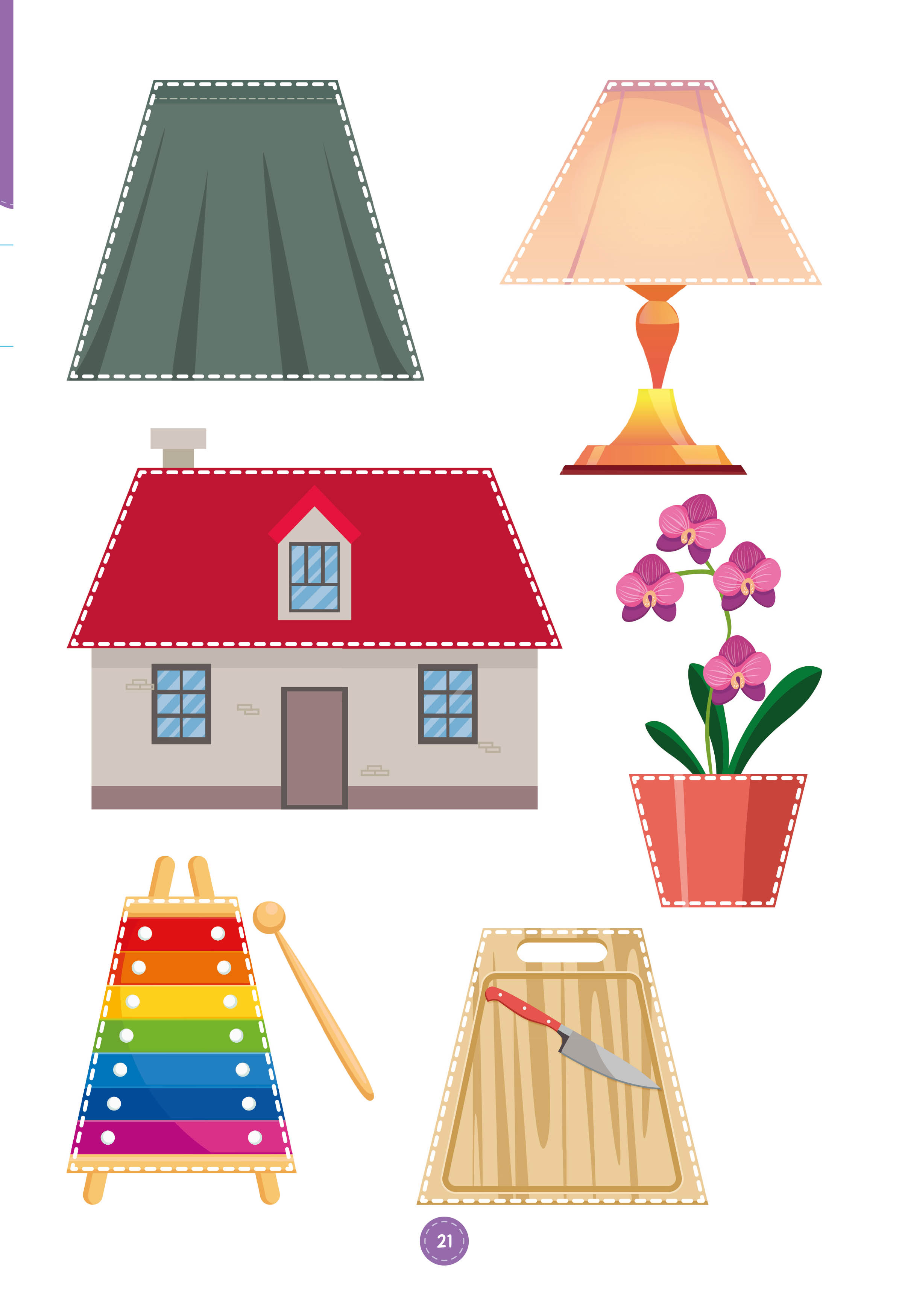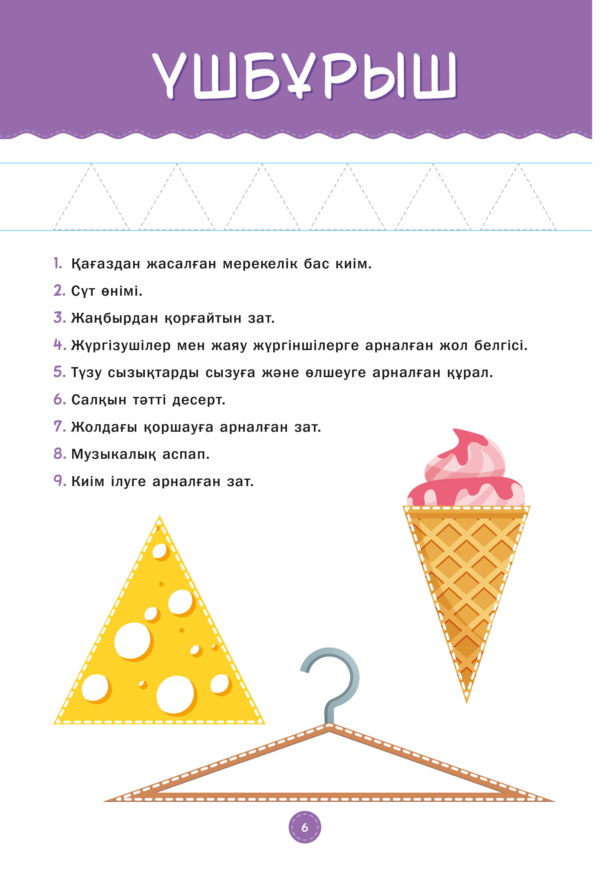 Құралдың ашылған екі бетінде үйреніп жатқан фигураға ұқсас заттардың ірі суреттері мен сабақты қызықты әрі танымдық ете түсетін сұрақтар берілген. Бала фигураны жақсырақ есте сақтауы үшін әрбір кескін нүктелі сызықпен қоршалған – бұл оған суреттің жиегін бастырып шығуға мүмкіндік береді. Мұндай тапсырмалар ұсақ моториканы, зейінді және көру арқылы қабылдау қабілетін дамытуға септігін тигізеді. Басылымның соңында өткен материалды қайталауға және бекітуге арналған арнайы беттер орналасқан.