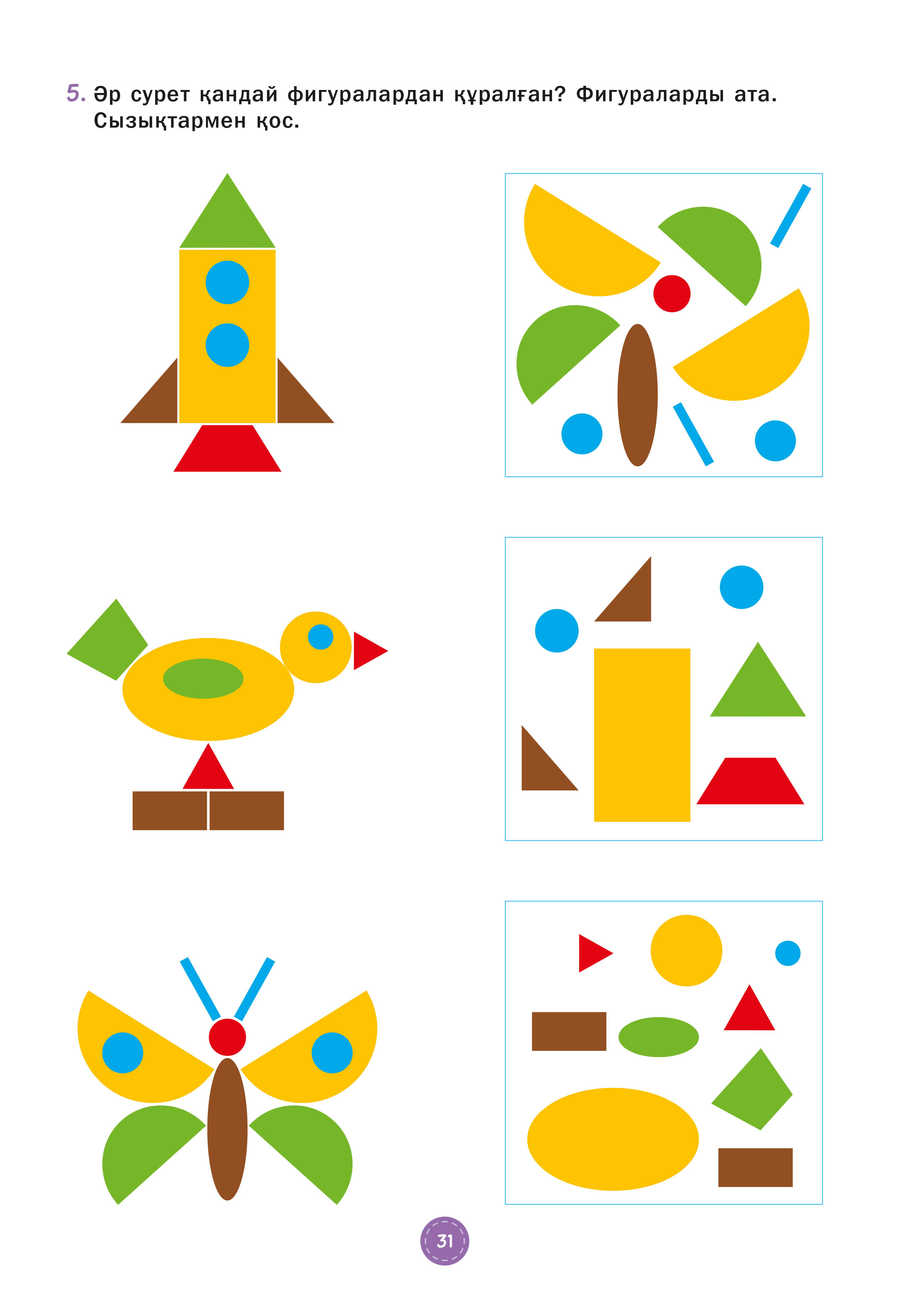Бұл оқу құралы баланы ашық суреттер, ойын тапсырмалары және танымал «Көрсет те, ата» ойыны арқылы фигуралардың қызықты әлемімен таныстырады. Егер бүлдіршін фигуралармен жаңадан таныса бастаса, оның шеңбер, үшбұрыш, шаршы, тіктөртбұрыш және сопақша атты негізгі атауларды білуі жеткілікті. Ал қалған фигуралармен олардың атауларын міндетті түрде жаттамай-ақ таныстыра беруге болады.