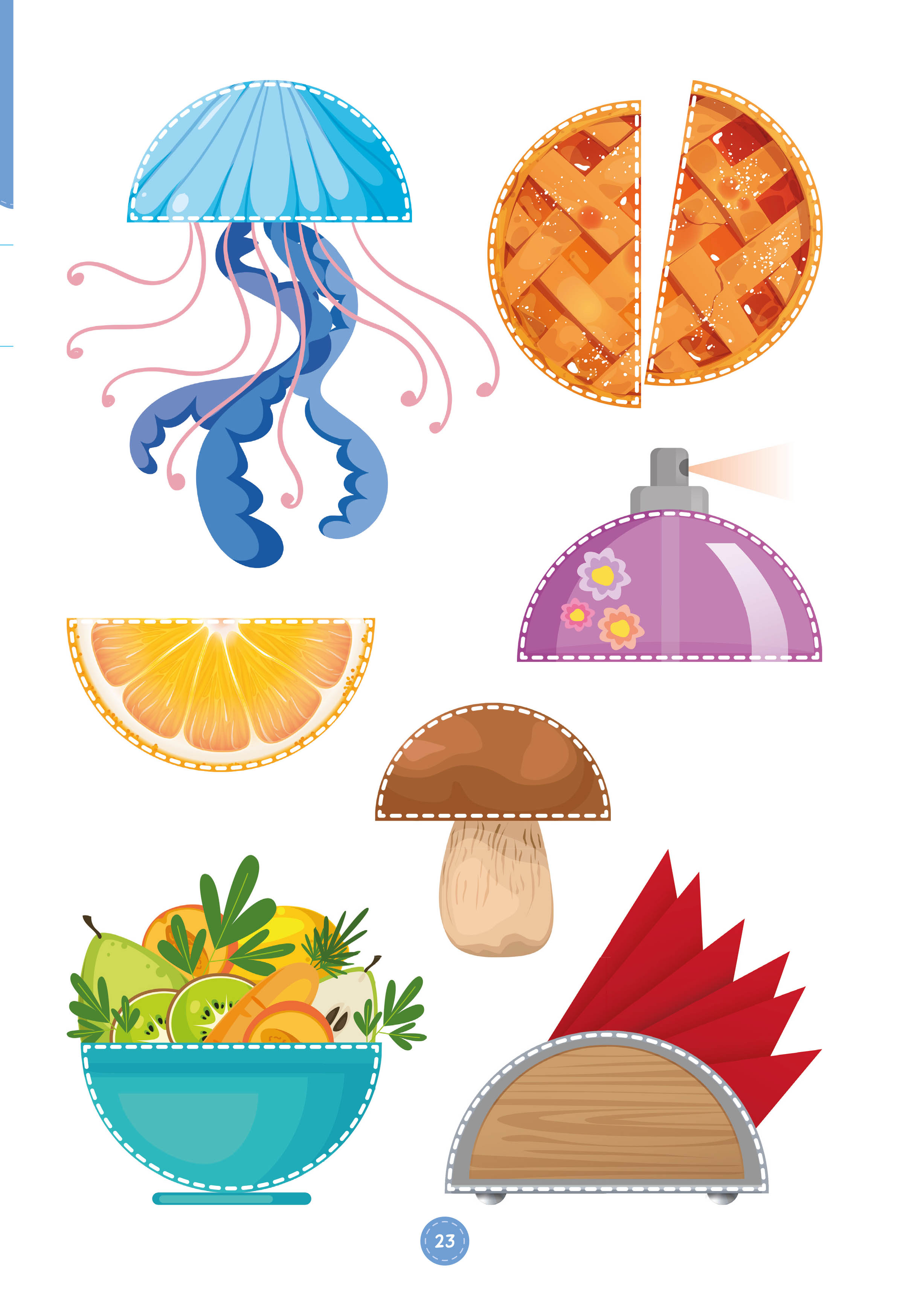 На разворотах представлены крупные изображения предметов, имеющих форму изучаемой фигуры, и вопросы, которые делают занятия не только интересными, но и познавательными. Каждое изображение обведено пунктирной линией, чтобы ребёнок мог обводить его по контуру и лучше запоминать форму. Такие задания способствуют развитию мелкой моторики, внимания и зрительного восприятия. В конце издания размещены развороты для повторения и закрепления изученного материала.