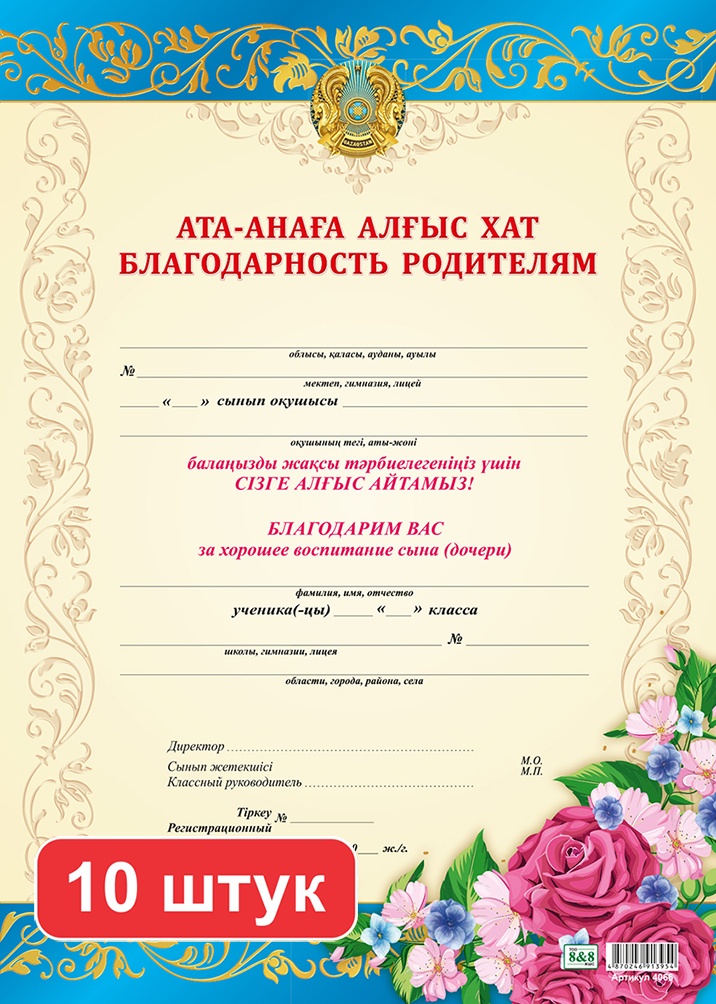Набор. Ата анаға алғыс хат / Благодарность родителям (за воспитание) (4066). 10 шт.