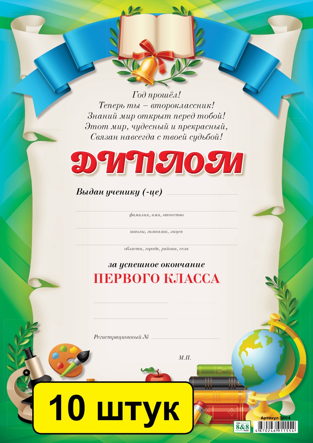 Диплом за успешное окончание первого класса. (заказ 3864) Комплект из 10 шт