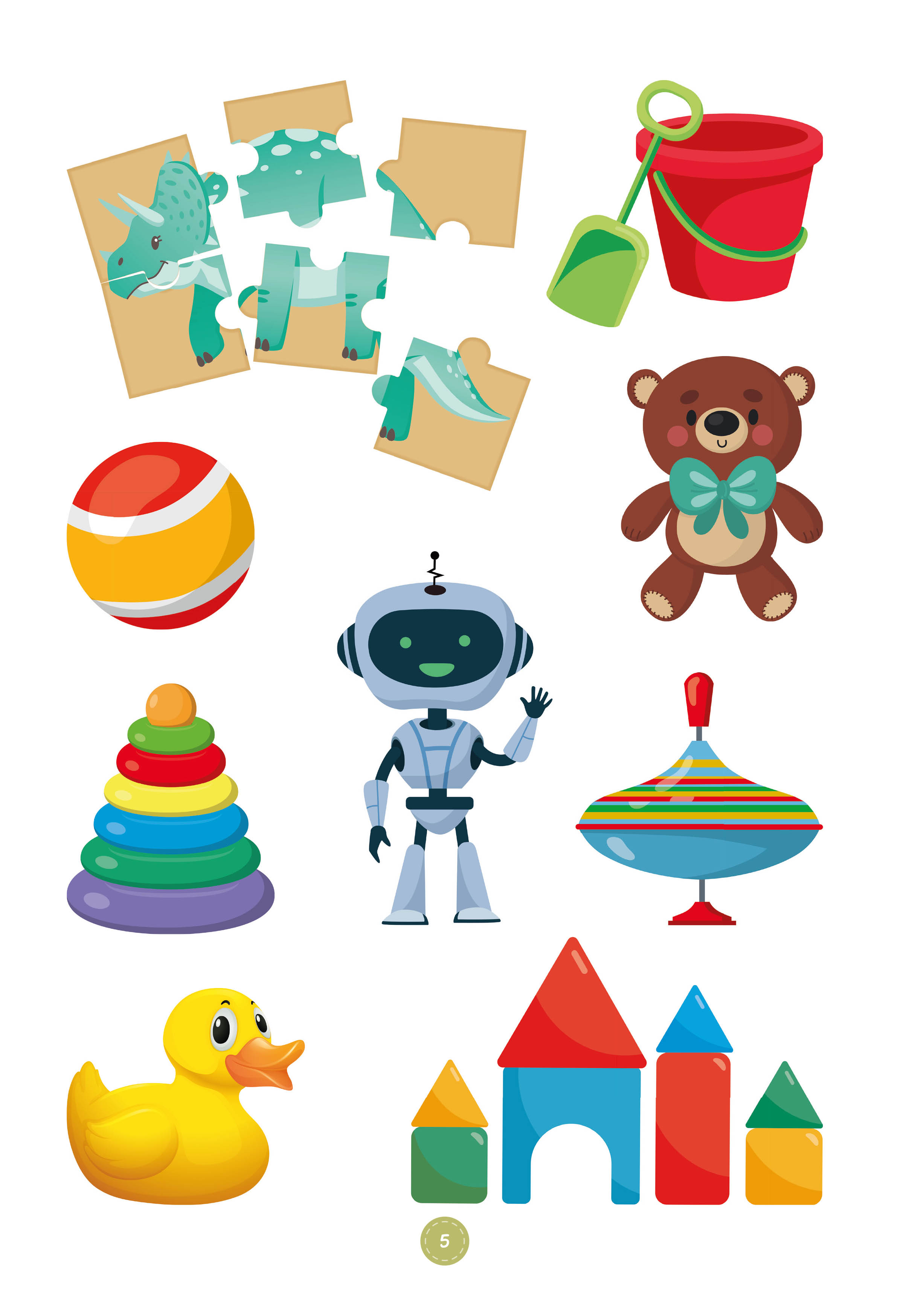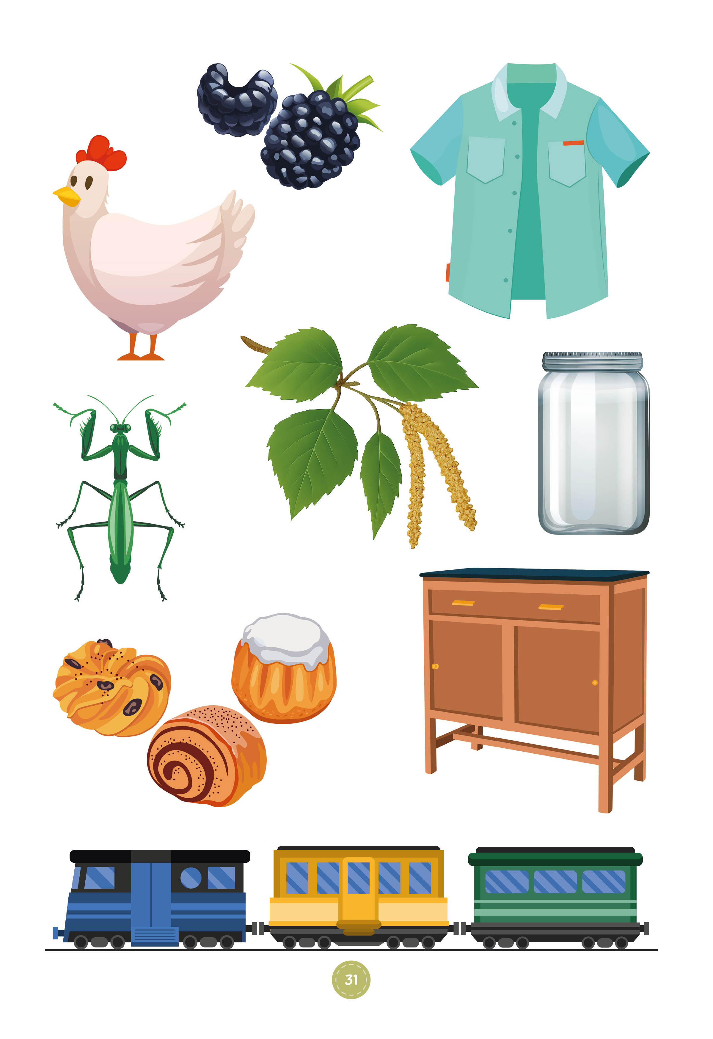 қоршаған орта, ойыншықтар, киім-кешек, ыдыс-аяқ, көлік, тұрмыстық заттар, тірі табиғат, аңдар, құстар, жәндіктер